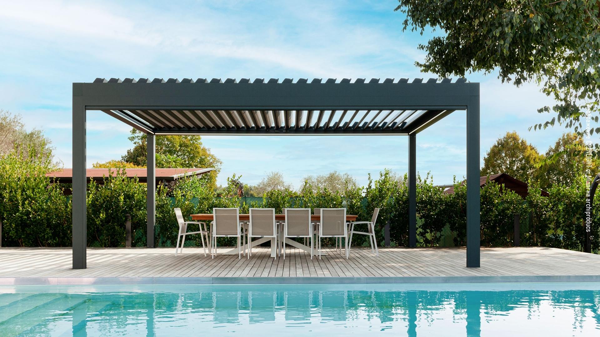 Это модульные конструкции из алюминиевых профилей, где роль крыши играют не ткань, а жесткие поворотные или поворотно-сдвижные ламели.