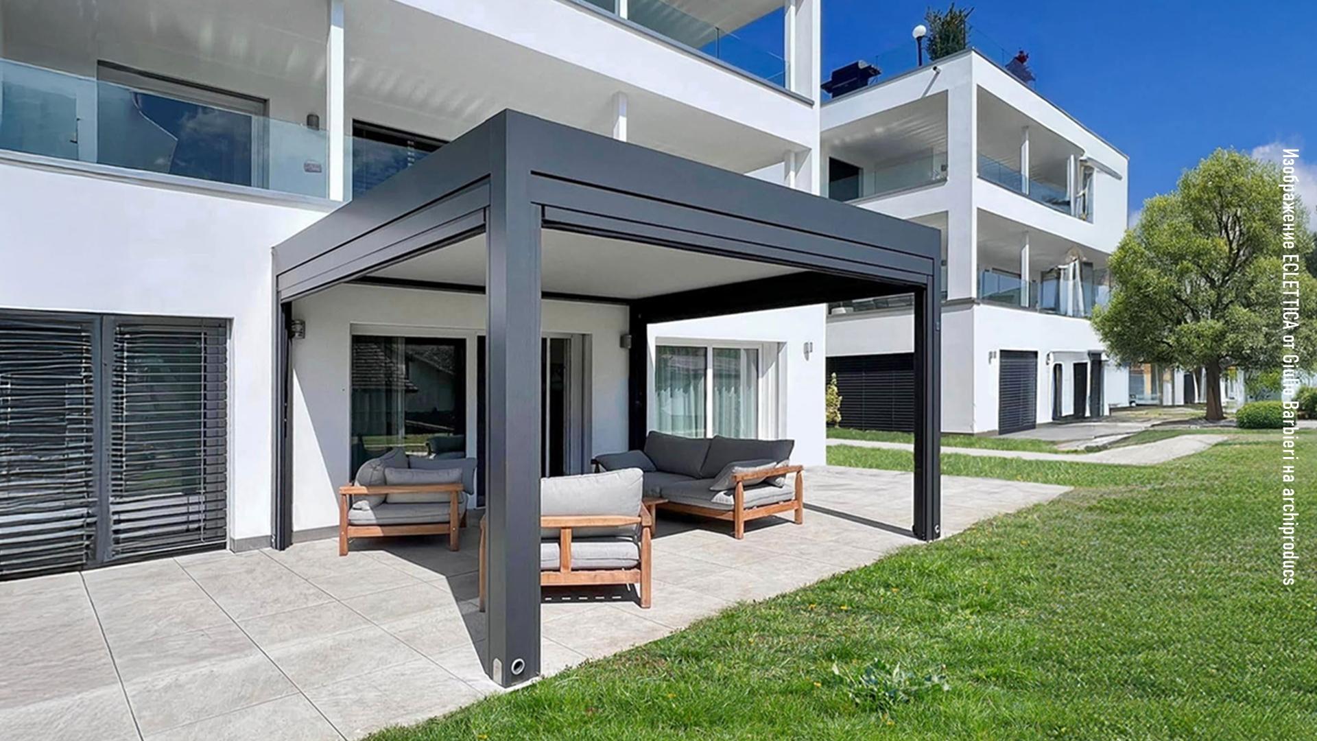 Биоклиматическая кровля с поворотными ламелями — это другой класс продуктов, представленный на сайте моделями «Бергамо» (ламели поворотные, 1 094 000 ₽) и «Милано» (ламели сдвижные, 1 185 500 ₽). Она идеальна для: